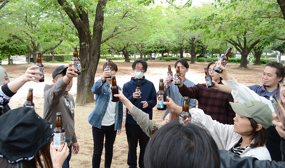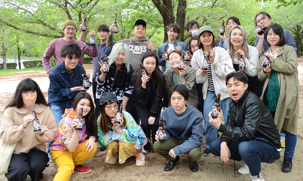 BBQでみんなで飲むため、会社から50本近く持ってきました!笑 普段飲まない人も、飲めない人も一度持ってもらって記念撮影!