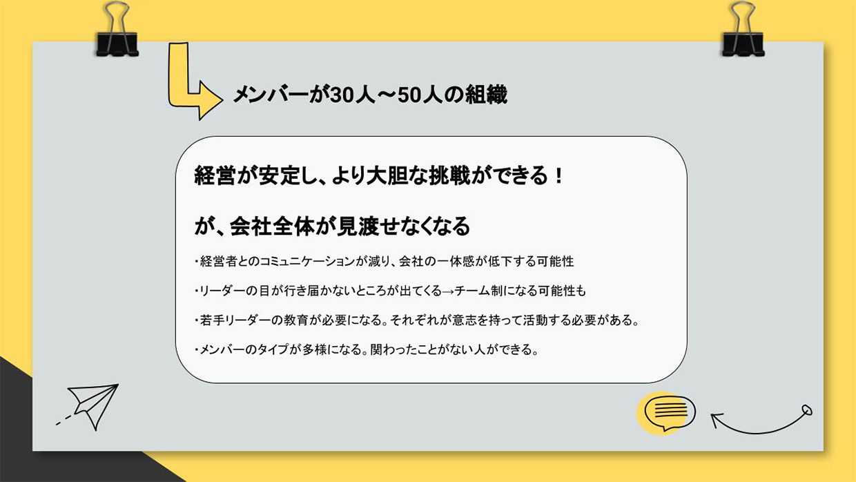 いまは25名ほどの会社ですが、2-3年後には50人規模の会社を目指しています。 そうなっていくと、立ちはだかるのが組織の壁。