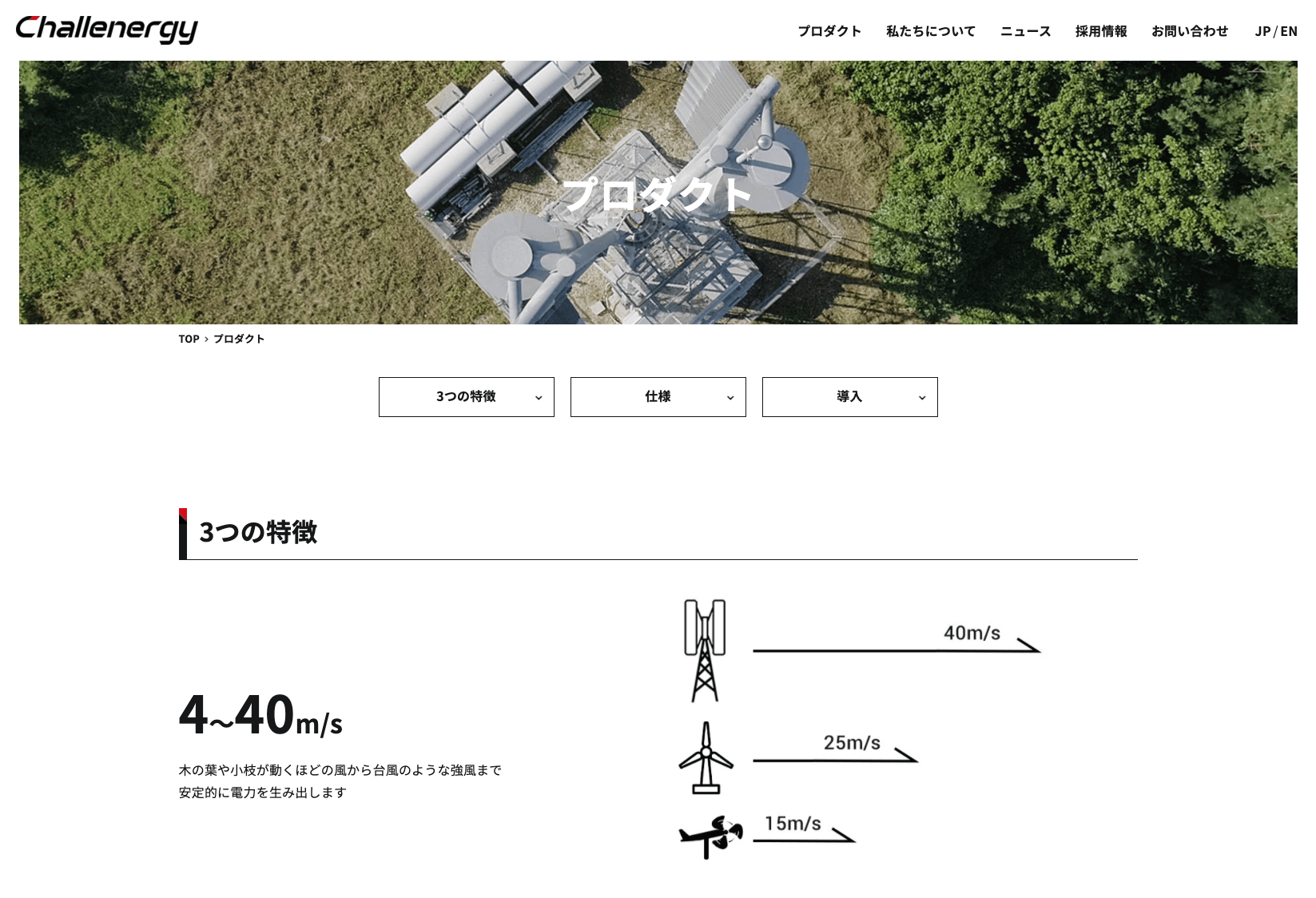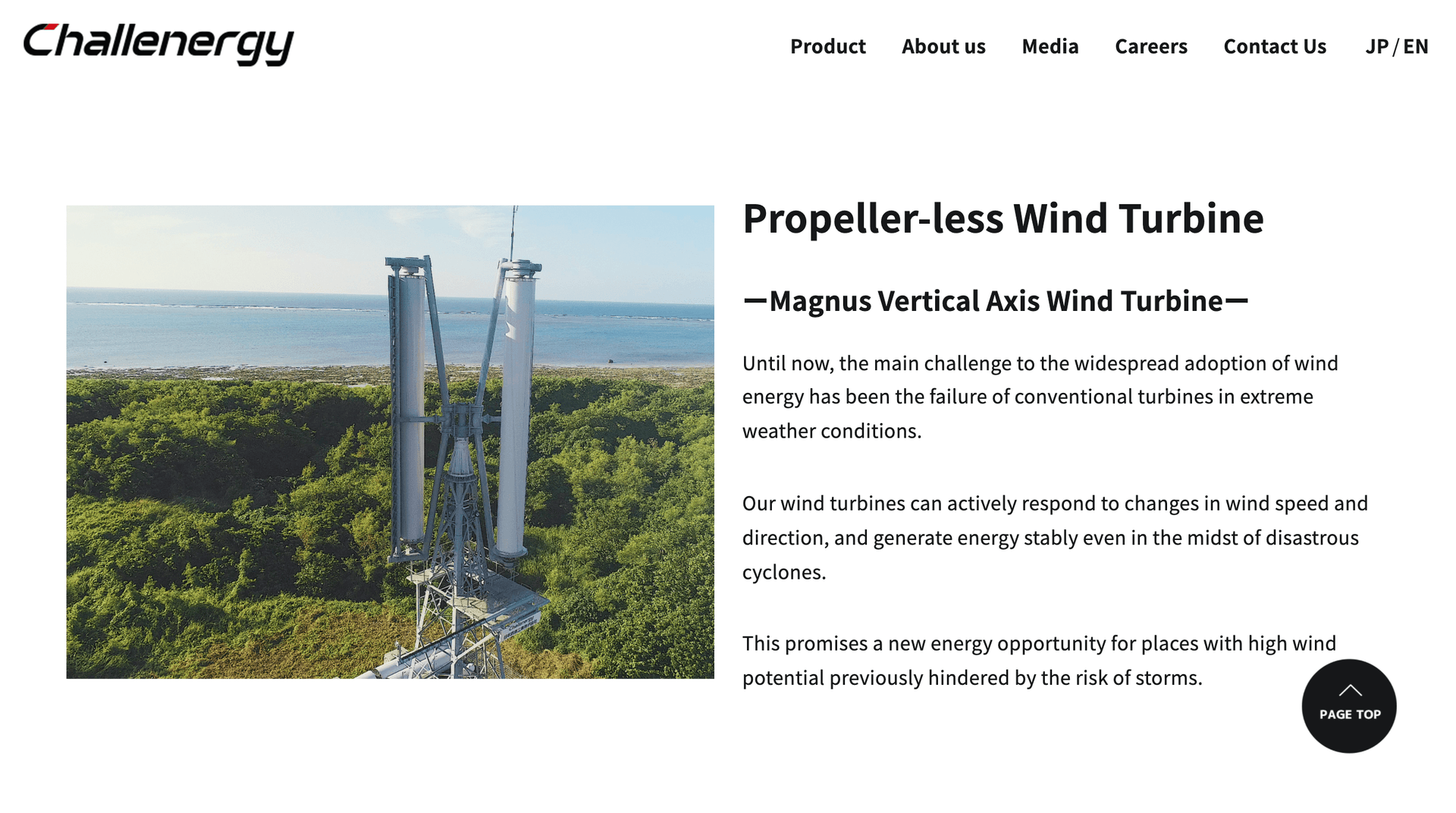 チャレナジー(challenergy)には、 エネルギー(energy)の課題に挑戦する(challenge)という想いが込められています。 「次世代のために、持続可能な発電方法の道筋を私たちが作らなければ」 清水代表は、2011年の東日本大震災をきっかけに決意されました。 そこから日本の環境にあった風力発電機の開発が始まったのです。 小型のマグナス風車を起点とした私たちの取り組みは、やがて大型化や洋上化の開発や、生み出されたエネルギーをサービスとして提供できる仕組み作りへと発展させていきます。 「風力発電にイノベーションを起こし、全人類に安心安全なエネルギーを供給する」をビジョンに掲げ、活動されています。