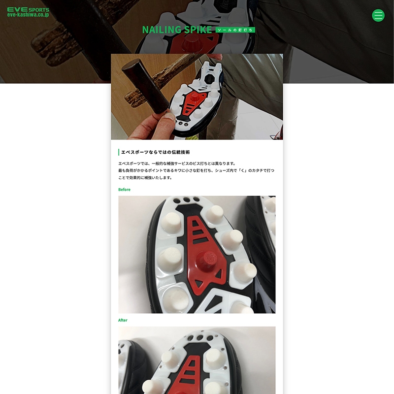 40年にわたって、柏市を中心に多くのサッカープレイヤー、サッカーチームを支えて来ました。このお店に通っていたプロ選手も少なくありません。エベスポーツ柏でしかできないスパイクの釘打ち、お店でスパイクを買うと無料、持ち込みでも3000円で実施可能です。単純に打つだけではなく、そこには洗練された技術が必要です。